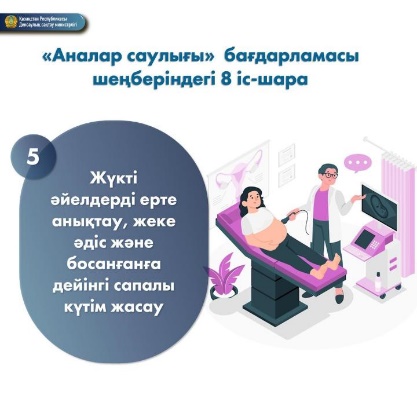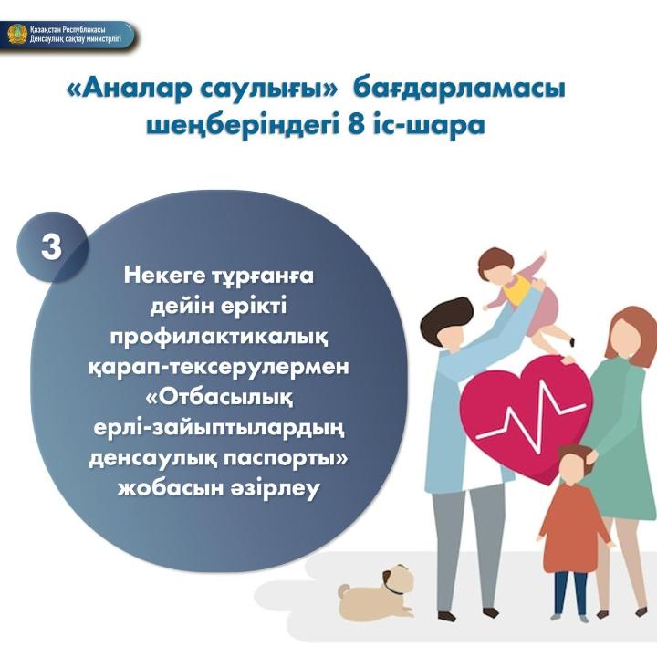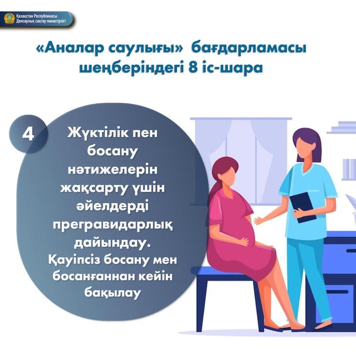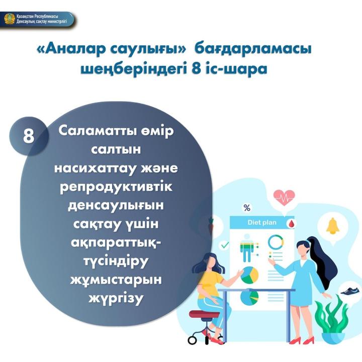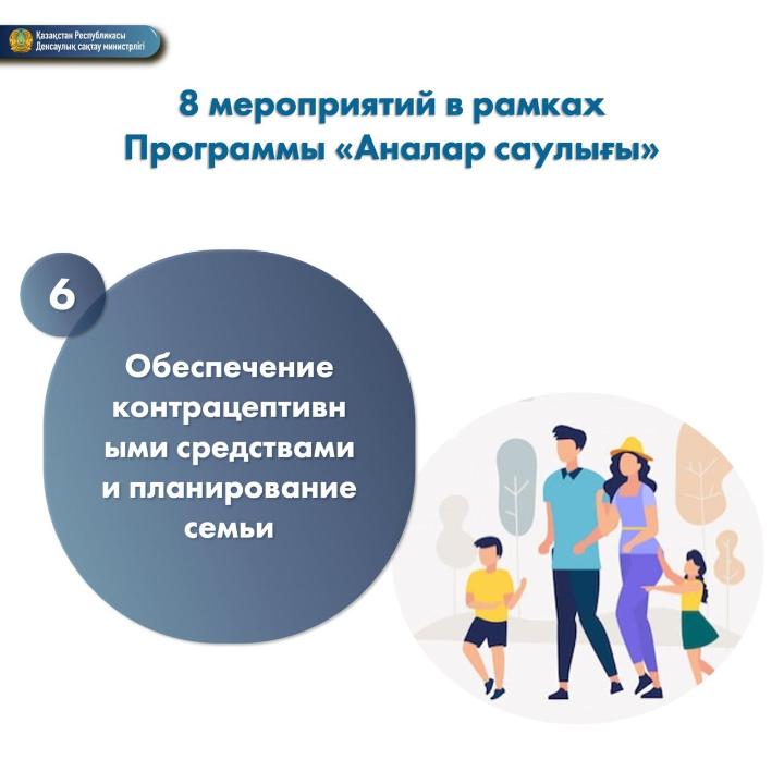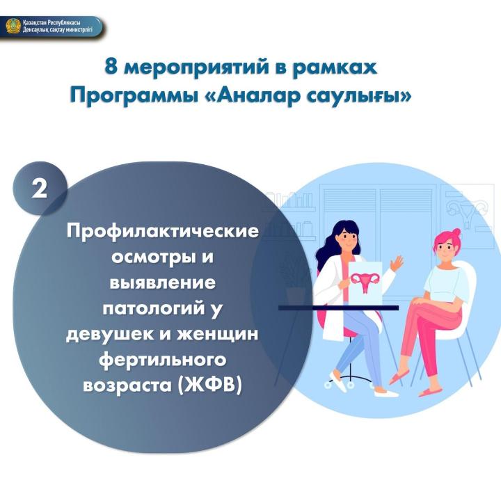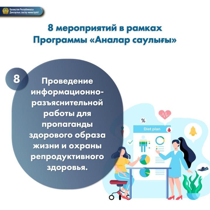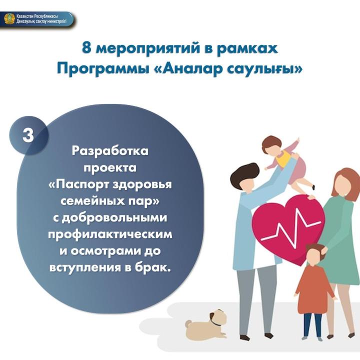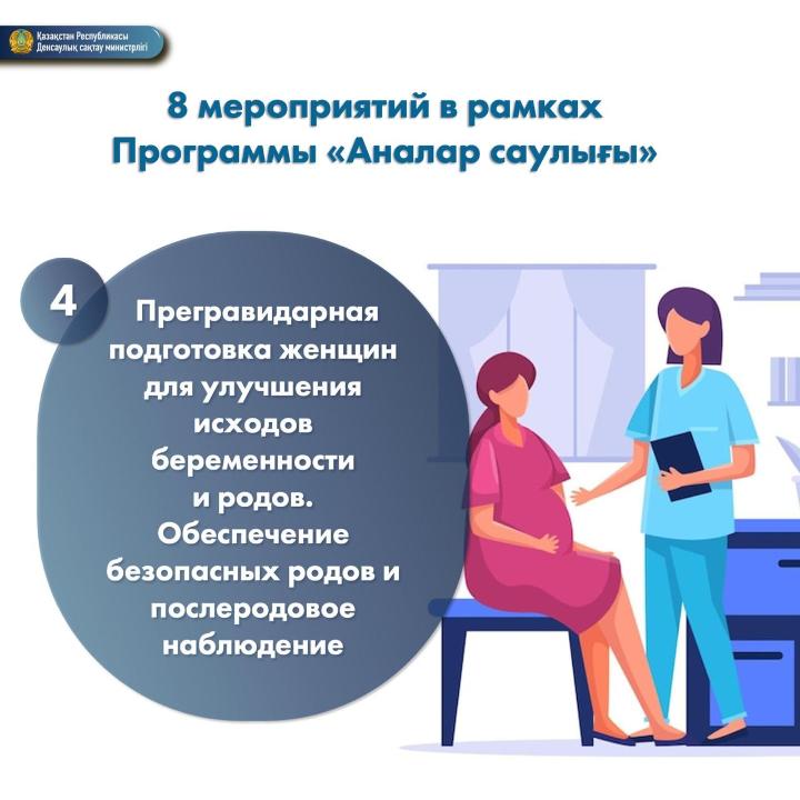 Министерством здравоохранения в целях сохранения репродуктивного здоровья подростков и укрепления здоровья женщин фертильного возраста разработана программа «Аналар саулығы», состоящая из 8 мероприятий. Участковыми врачами будет осмотрена каждая жительница фертильного возраста, планирующая беременность, для определения индекса ее здоровья.