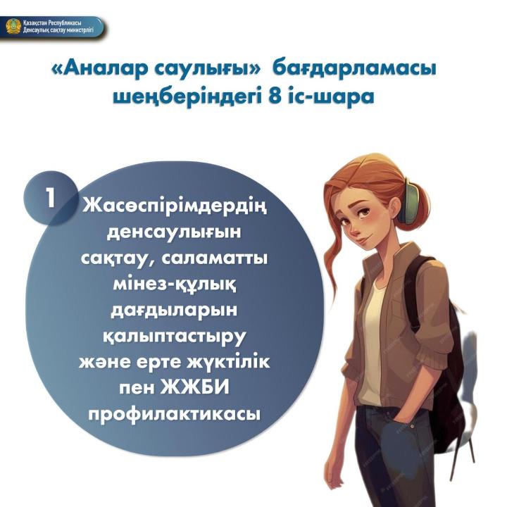 Қазақстан Республикасының Денсаулық сақтау министрлігі жасөспірімдердің репродуктивті денсаулығын сақтау және ұрпақты болу жасындағы әйелдердің денсаулығын нығайту мақсатында 8 іс-шарадан тұратын «Аналар саулығы» бағдарламасын әзірледі.